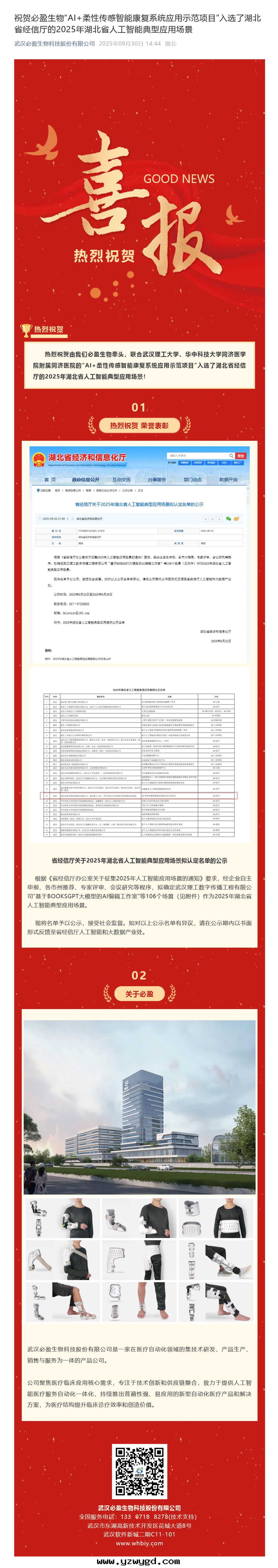祝贺必盈生(shēng)物(wù)“AI+柔性(xìng)传感(gǎn)智能(néng)康複系(xì)統應(yìng)用(yòng)示範項目”入(rù)選了(le)湖(hú)北省經(jīng)信(xìn)廳的(de)2025年(nián)湖(hú)北省人(rén)工智能(néng)典型應(yìng)用(yòng)场(chǎng)景
