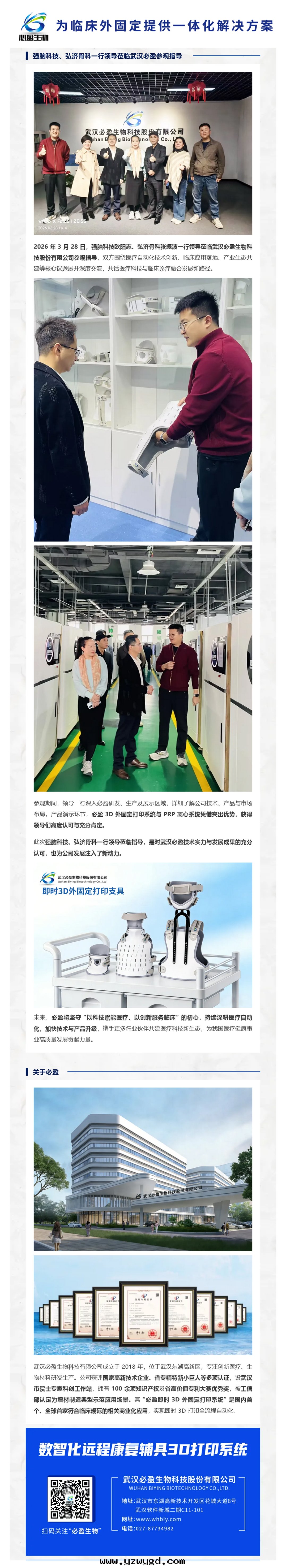 2026 年(nián) 3 月(yuè) 28 日(rì),強(qiáng)腦科技歐陽志、弘濟骨(gǔ)科张振波(bō)一(yī)行領導莅臨武漢必盈生(shēng)物(wù)科技股份有(yǒu)限公(gōng)司參觀指導