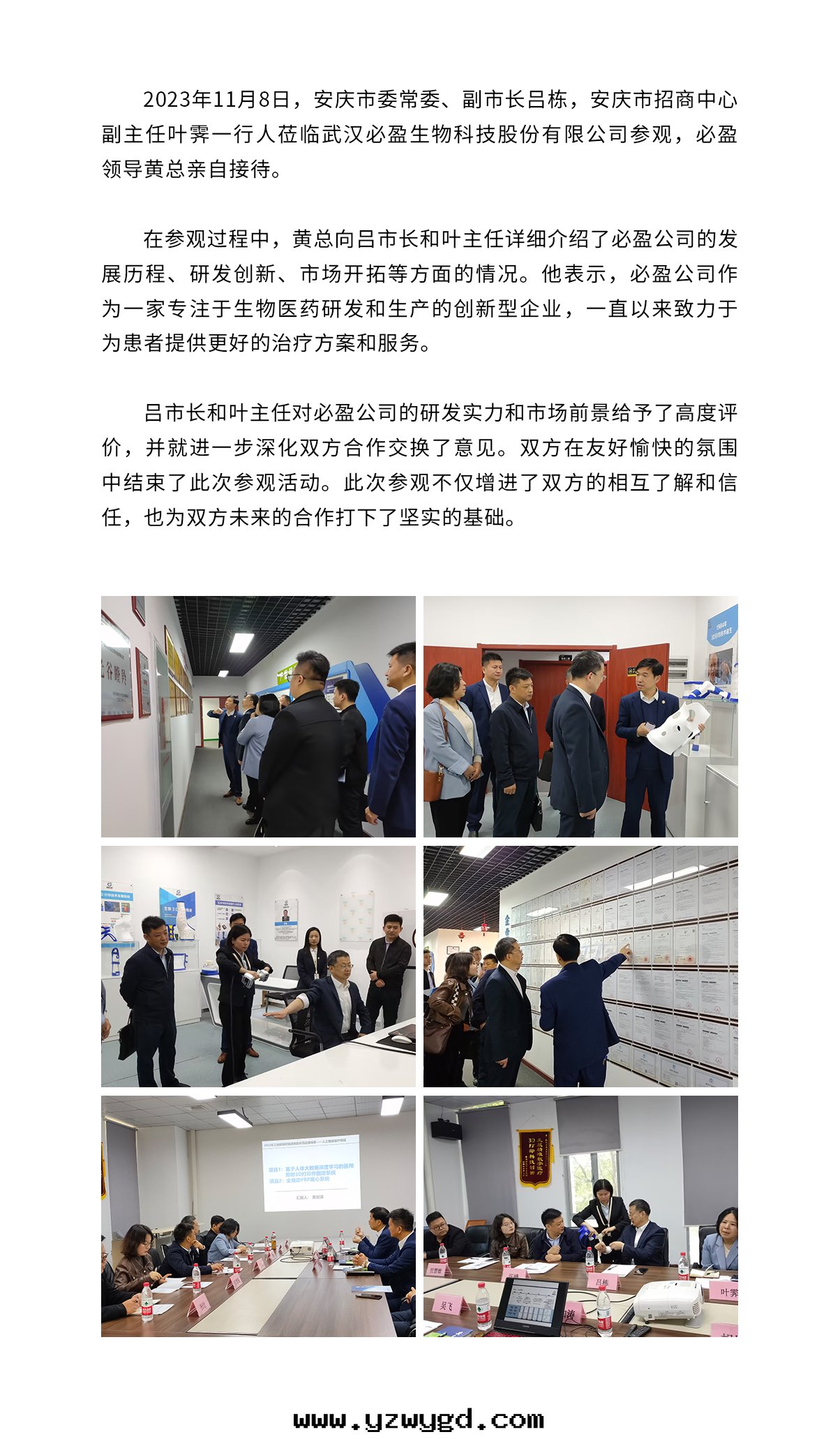 2023.11.8日(rì)安(ān)慶市(shì)委常委、副市(shì)长(cháng)呂棟,安(ān)慶市(shì)招商中(zhōng)心(xīn)副主任葉(yè)霁一(yī)行人(rén)莅臨武漢必盈生(shēng)物(wù)科技股份有(yǒu)限公(gōng)司參觀