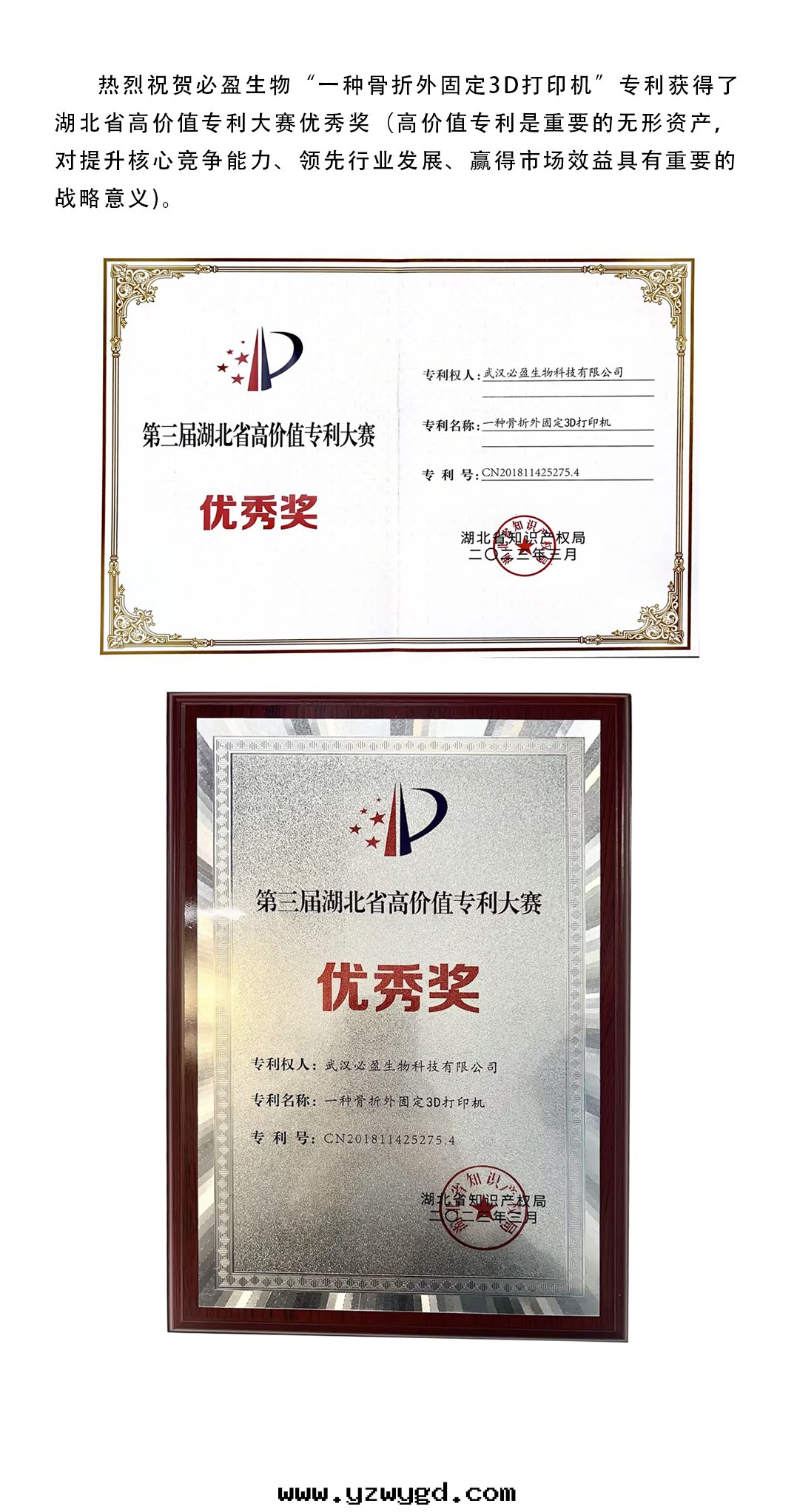 热(rè)烈祝贺必盈生(shēng)物(wù)“一(yī)種(zhǒng)骨(gǔ)折外(wài)固定(dìng)3D打印(yìn)機(jī)”專利獲得了(le)湖(hú)北省高(gāo)價值專利大(dà)賽優秀獎!