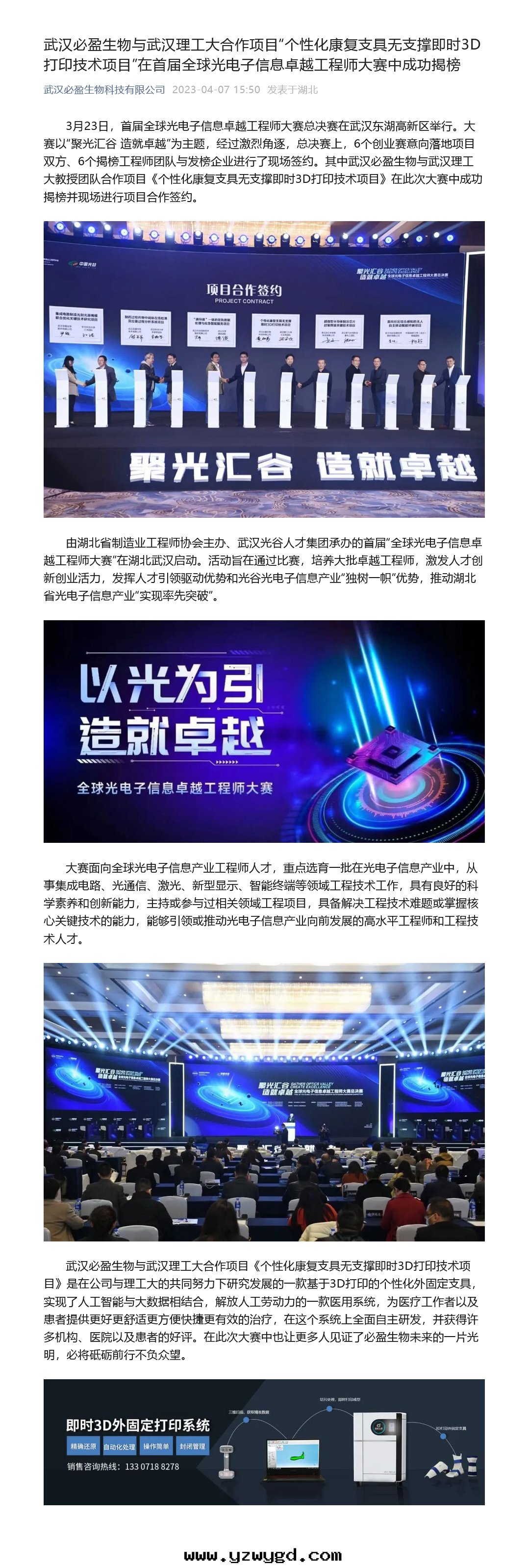 武漢必盈生(shēng)物(wù)與(yǔ)武漢理(lǐ)工大(dà)合作(zuò)項目“个(gè)性(xìng)化(huà)康複支具無支撐即时(shí)3D打印(yìn)技術(shù)項目”在(zài)首屆全(quán)球光(guāng)電(diàn)子信(xìn)息卓越工程师(shī)大(dà)賽中(zhōng)成(chéng)功揭榜