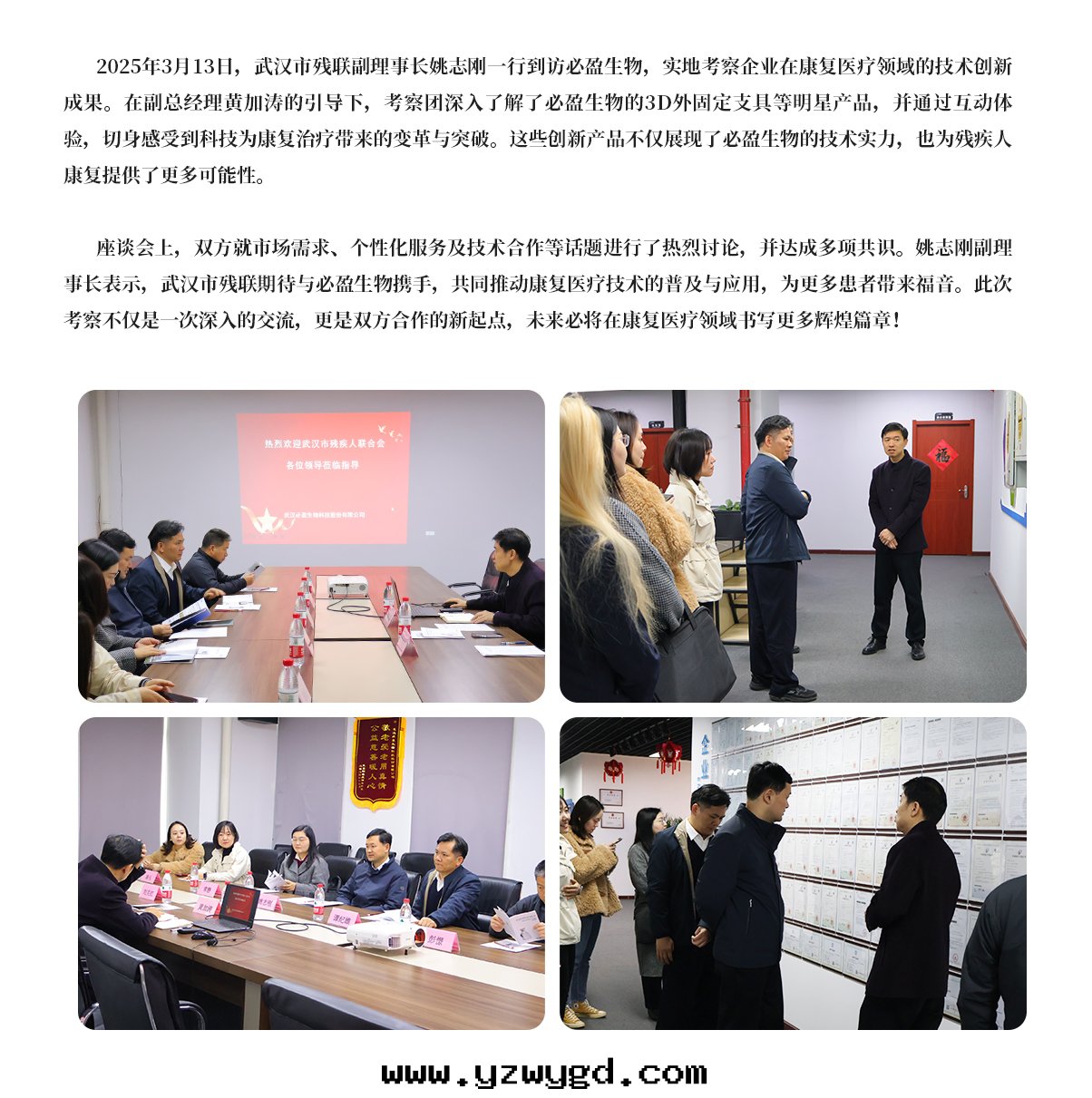 2025年(nián)3月(yuè)13日(rì)热(rè)烈歡迎武漢市(shì)残疾人(rén)聯合会(huì)副理(lǐ)事(shì)长(cháng)姚志剛等多(duō)位(wèi)領導莅臨必盈生(shēng)物(wù)指導公(gōng)司,必盈副總(zǒng)經(jīng)理(lǐ)黃加濤(tāo)热(rè)情(qíng)接待。