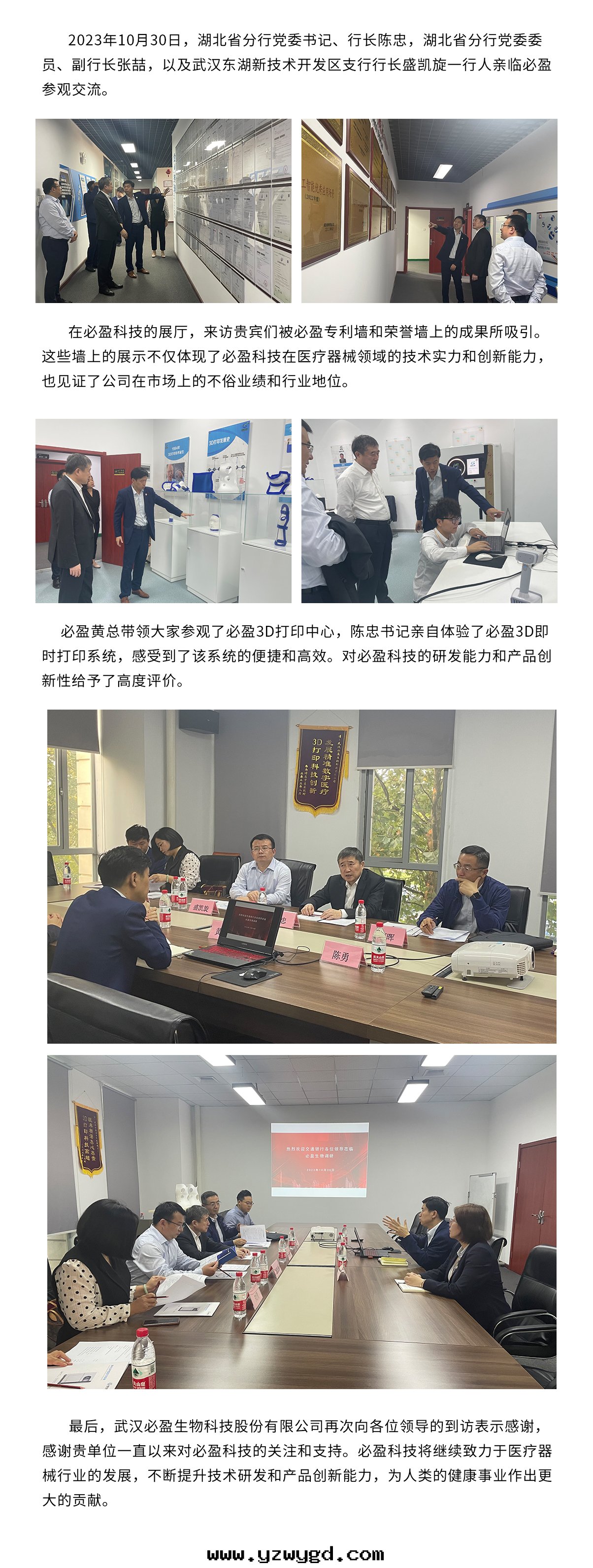 2023年(nián)10月(yuè)30日(rì)湖(hú)北省分行黨委書(shū)記(jì)、行长(cháng)陳忠,湖(hú)北省分行黨委委员、副行长(cháng)张喆,武漢東(dōng)湖(hú)新(xīn)技術(shù)開(kāi)發(fà)区支行行长(cháng)盛凯旋一(yī)行人(rén)莅臨必盈參觀