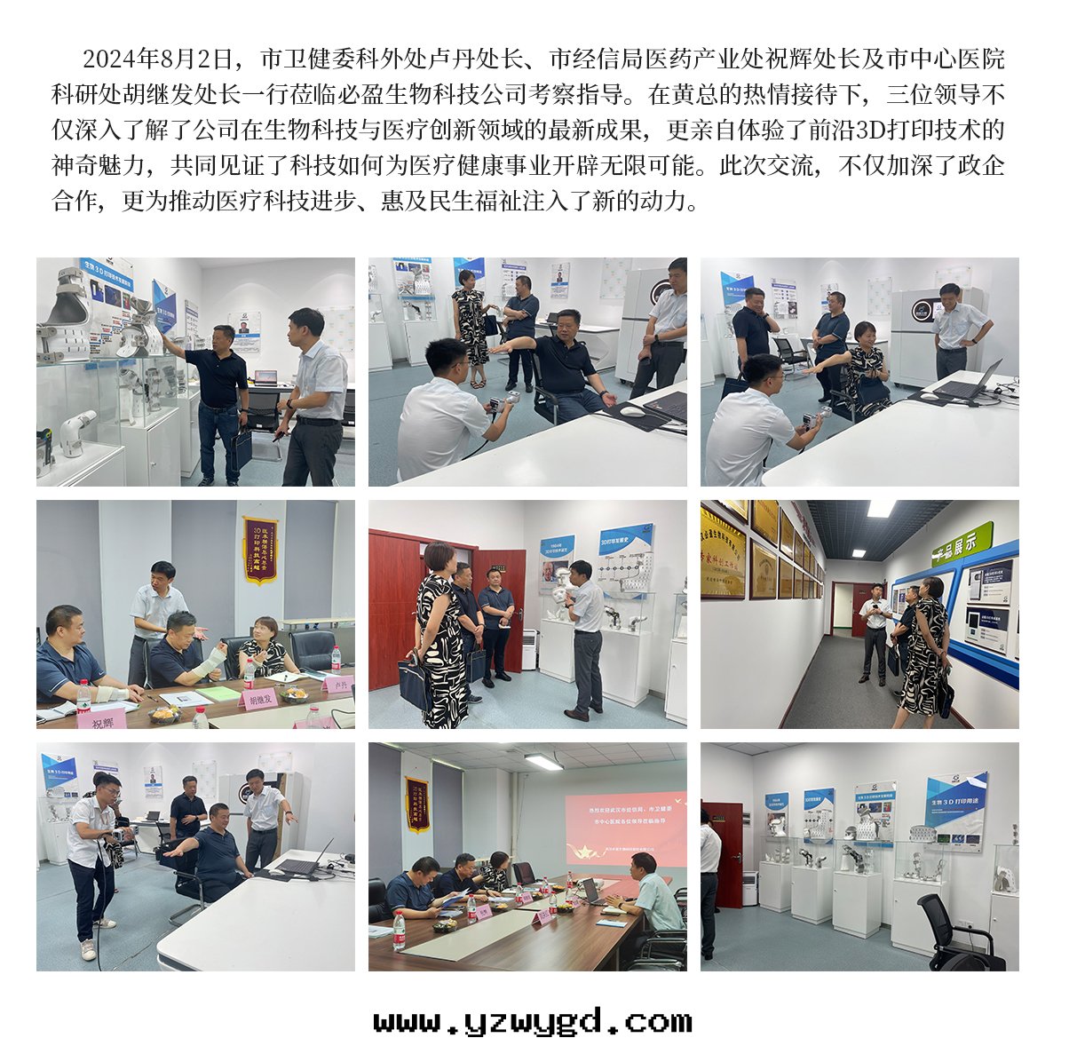 2024年(nián)8月(yuè)2日(rì)市(shì)衛健委科外(wài)處(chù)盧丹處(chù)长(cháng),市(shì)經(jīng)信(xìn)局(jú)醫藥産業處(chù)祝輝處(chù)长(cháng),市(shì)中(zhōng)心(xīn)醫院(yuàn)科研處(chù)胡繼發(fà)處(chù)长(cháng)幾(jǐ)位(wèi)領導莅臨必盈參觀