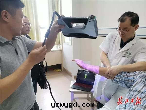 The reporter saw at the scene that the doctor performed a 3D scan of the injured right hand arm and left ankle of the patient through special equipment. While scanning, the computer modeled by reading the data, and the bracket model was automatically established based on the modeling. Finally, the 3D printer was used to The stand prints out.
